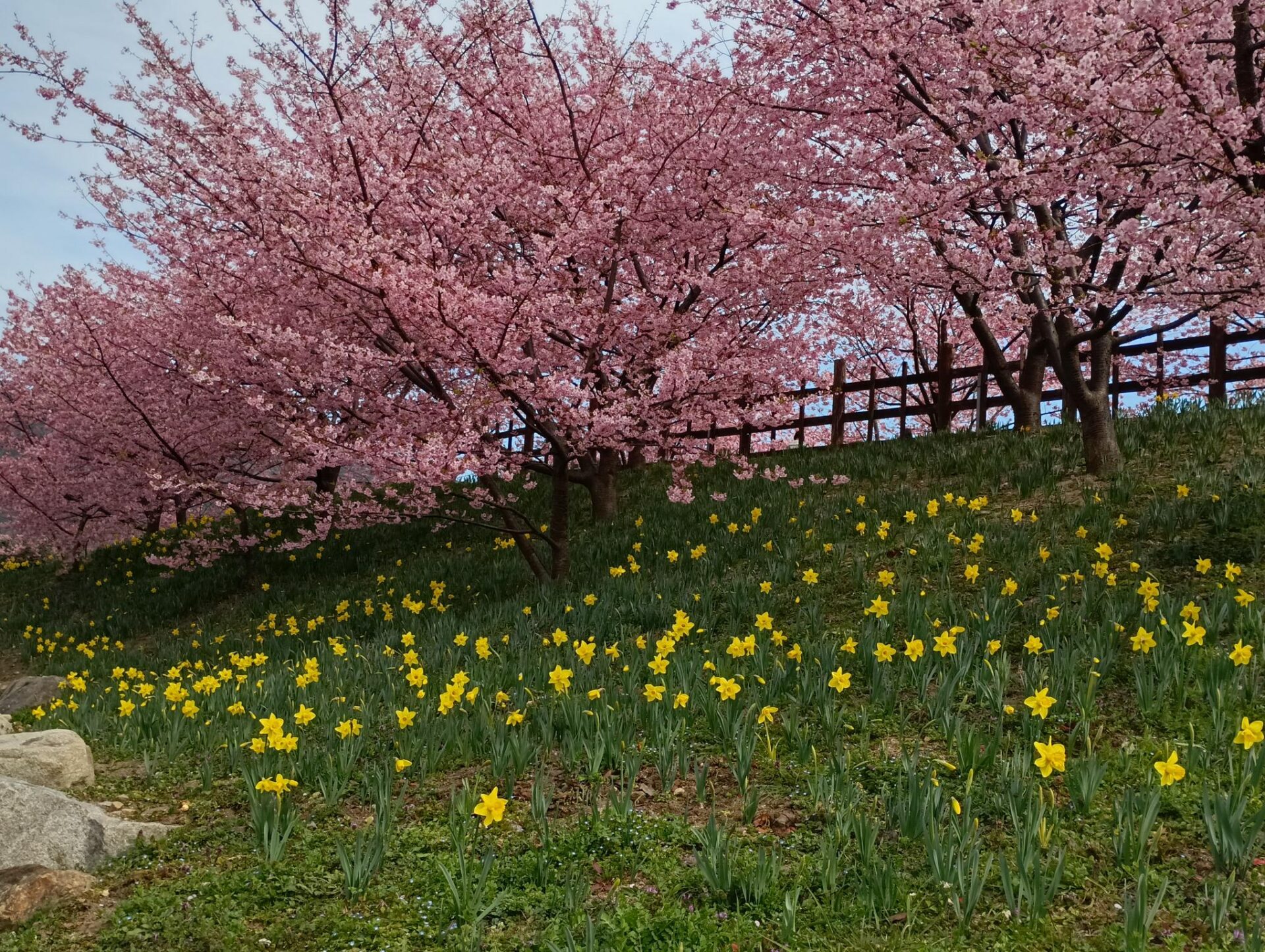 この陽気に誘われ、河津桜で有名な近郊の公園に連休中に行ってきました。公園内には約190本の河津桜が植えられていますが、鮮やかなピンク色の桜と黄色いスイセンのコントラストが美しい景色を作り出していました。時々花びらが風になびく様子は、まさに春を感じるひと時となりました。